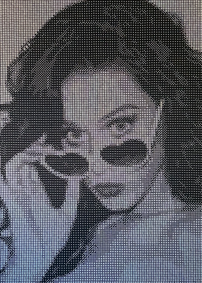Als basis kies ik een onderwerp of foto met voldoende contrast en details. Deze foto wordt bijgesneden tot het juiste formaat, omgezet in zwart wit en in pixels.